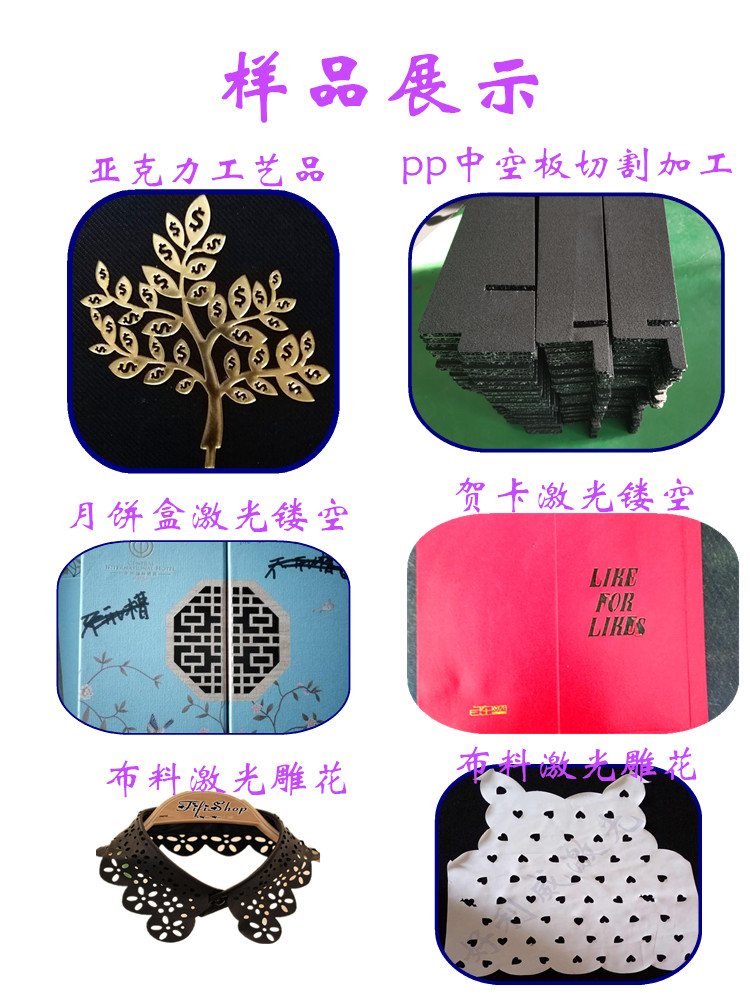 本公司專業對外加工布料切割加工、無紡布毛氈激光鏤空 皮革激光加工、服裝布料激光雕花、麂皮絨激光切割、亞克力,竹木盒月餅盒激光加工,皮革激光雕花等。激光沖孔切割不發黑不發黃不發臭無黑灰”受到眾多客戶認可歡迎打樣咨詢。